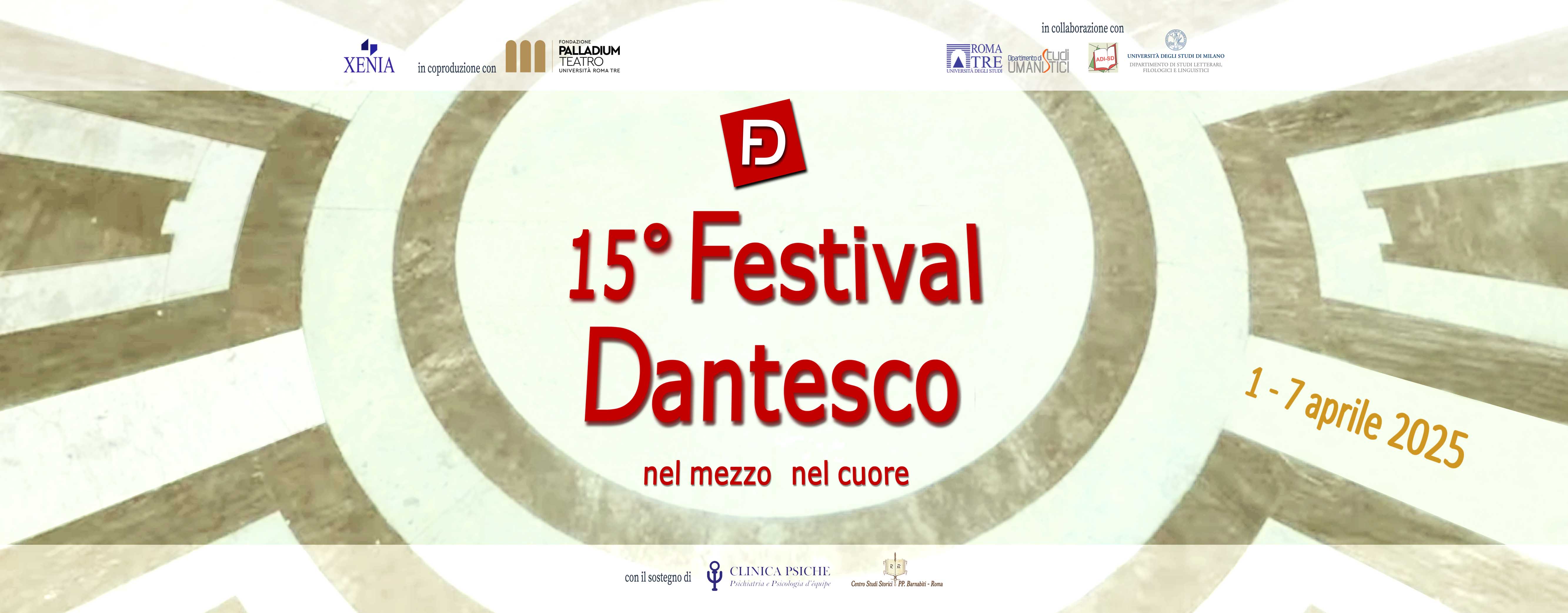 Ideato e prodotto da Xenia, con la direzione artistica di Paolo Pasquini e Agnese Ciaffei, e la Responsabilità Scientifica di Maurizio Fiorilla, Ordinario di Filologia della Letteratura Italiana presso l’Università degli Studi Roma Tre, il 15° Festival Dantesco avrà come evento culmine la serata di lunedì 7 aprile al Teatro Palladium di Roma. Dalle ore 20 sul palco, sullo schermo e nel foyer dello storico teatro dell’Università Roma Tre l’opera dantesca sarà riattraversata dai linguaggi del teatro, del cinema e della fotografia ad opera di giovani appassionati, di artisti e di esperti accademici, per un pubblico di ogni età e di ogni livello di conoscenza della Commedia. Tra gli ospiti, Valentina Vannicola, che presenterà alcune delle sue opere fotografiche dantesche, esposte in tutto il mondo; l’équipe di psichiatri e psicologi di Clinica Psiche, dalla Svizzera, che proporrà il cortometraggio fuori concorso Post it, una originale riflessione sulla Colpa; e ancora, da Varsavia, la Polish-Japanese Academy of Information Technology con le sue opere video e fotografiche.Coprodotta dalla Fondazione Roma Tre Teatro Palladium, la serata è realizzata in collaborazione con il Dipartimento di Studi Umanistici dell’Università degli Studi Roma Tre nonché con il Dipartimento di Studi Letterari, Filologici e Linguistici dell’Università di Milano e la Sezione Didattica dell’Associazione degli Italianisti.